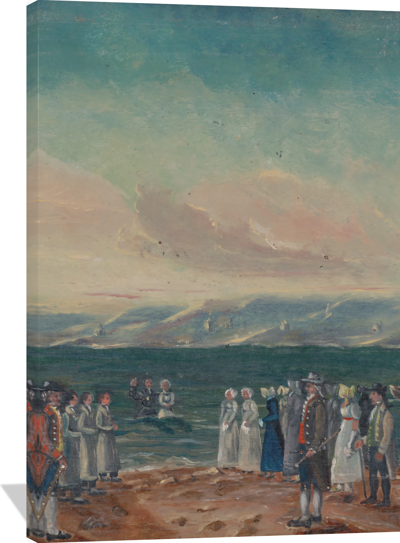 The William P. Chappel Baptism canvas captures a serene coastal gathering bathed in the soft glow of a setting sun. Gentle hues of sea green, rose, and muted gold blend across the sky and water, evoking a sense of quiet devotion and timeless ritual. Figures dressed in early American attire stand along the shore, their reflections shimmering in the calm tide.