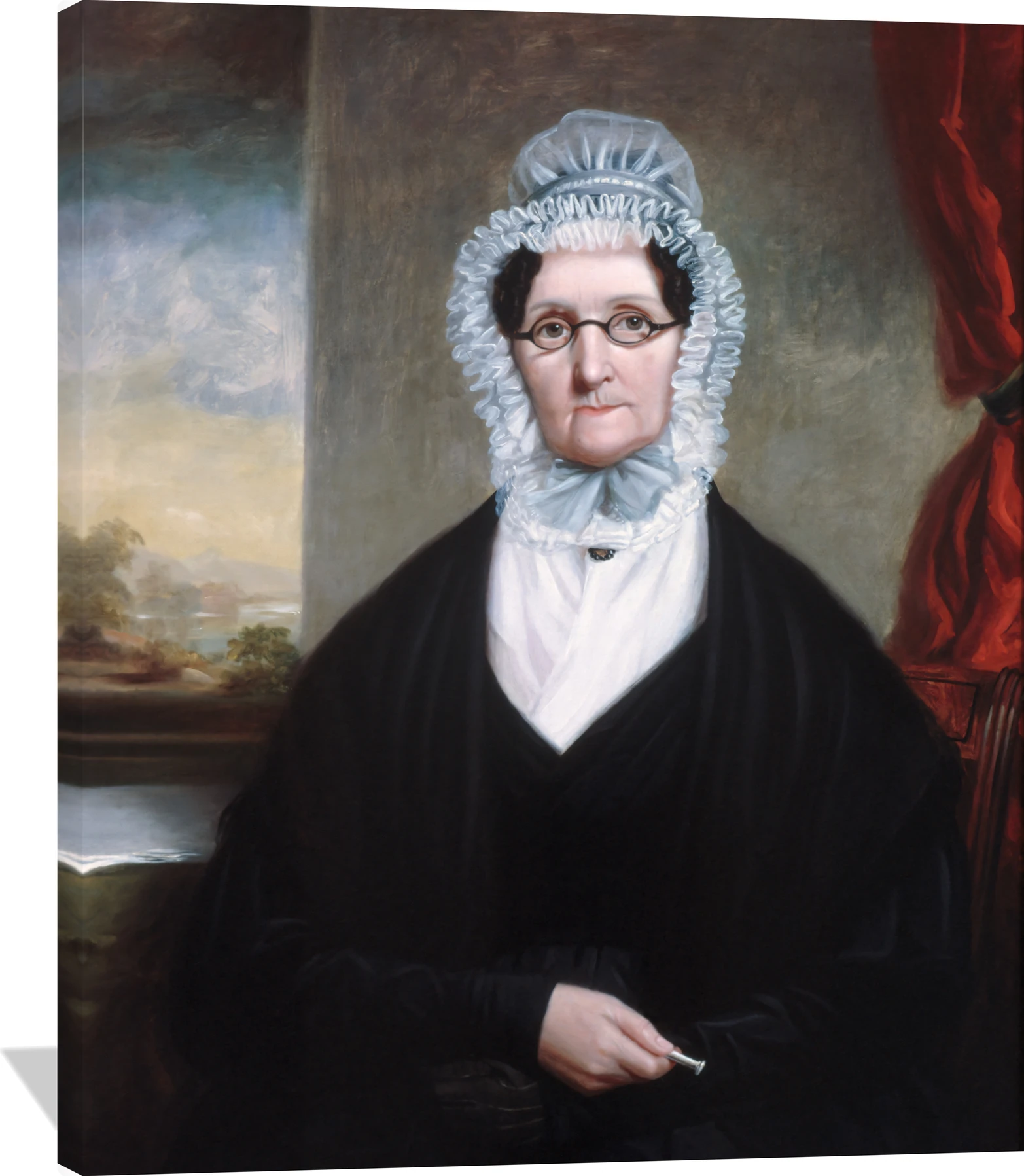 The Shepard Alonzo Mount Catherine Brooks Hall canvas captures the quiet dignity and refined grace of 19th-century portraiture. Rendered in soft, natural light with tones of black, ivory, crimson, and muted gold, this vertical composition exudes timeless elegance and composure. The artist’s delicate brushwork and attention to texture bring a serene realism to the sitter’s expression and attire.