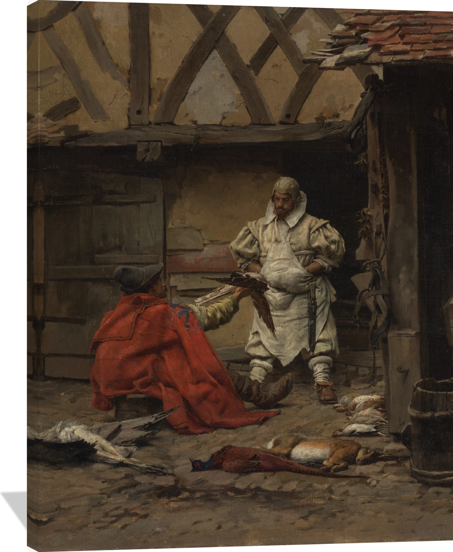 The Alexandre-Louis Leloir Choosing the Dinner canvas captures a rustic courtyard scene alive with texture and quiet narrative. A hunter and cook engage in a moment of decision, surrounded by the day’s catch, rendered in warm earth tones of ochre, sienna, and muted gray. Leloir’s masterful realism and soft light evoke the intimacy of daily life in 19th-century France.