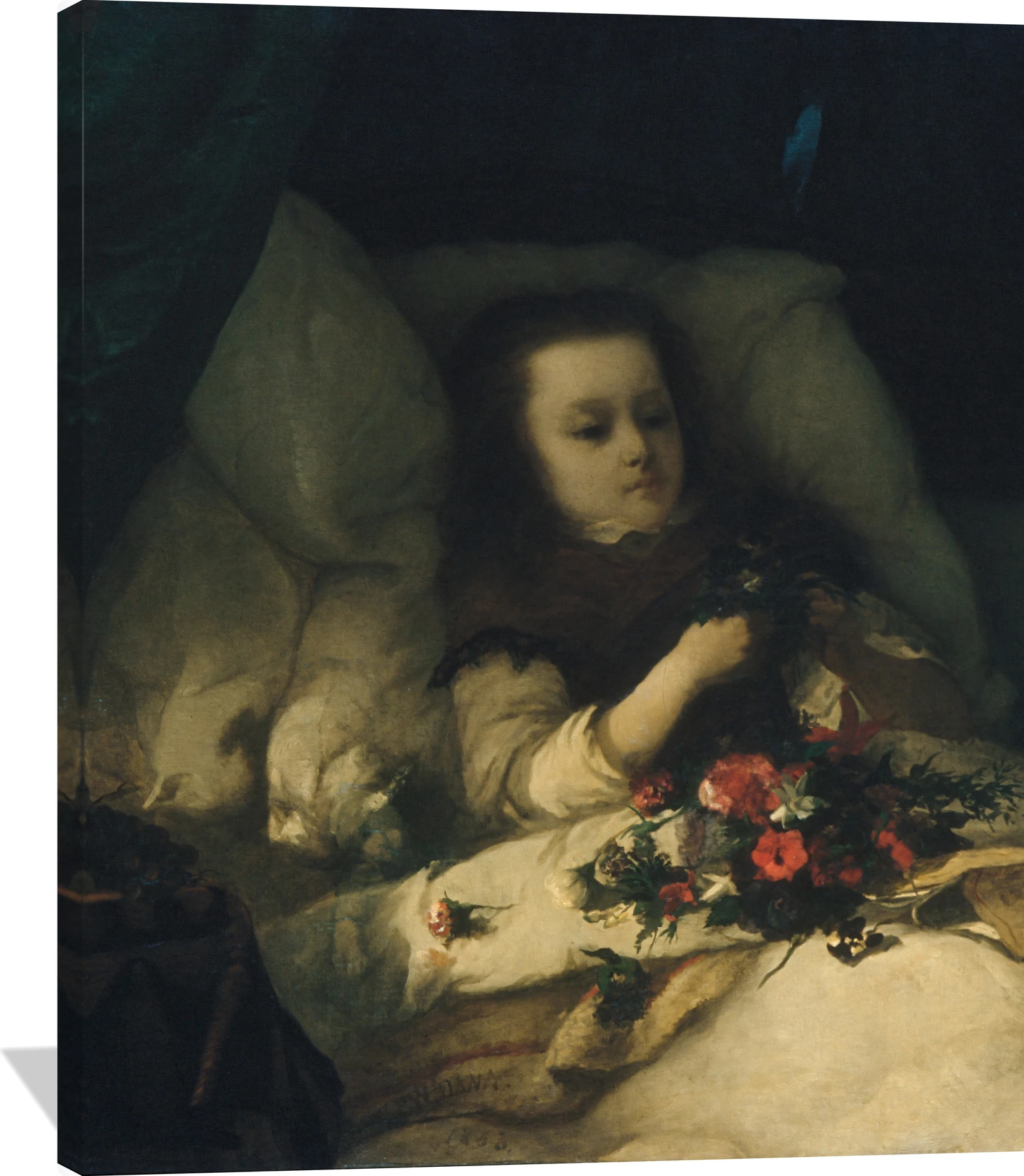 The William P. W. Dana Heart’s Ease canvas captures a tender, introspective moment bathed in soft golden light. A young girl reclines amid gentle folds of linen, her delicate hands arranging a bouquet of vivid red and violet blooms. Deep emerald, warm ivory, and muted brown tones create a serene contrast that evokes both calm and quiet reflection.
