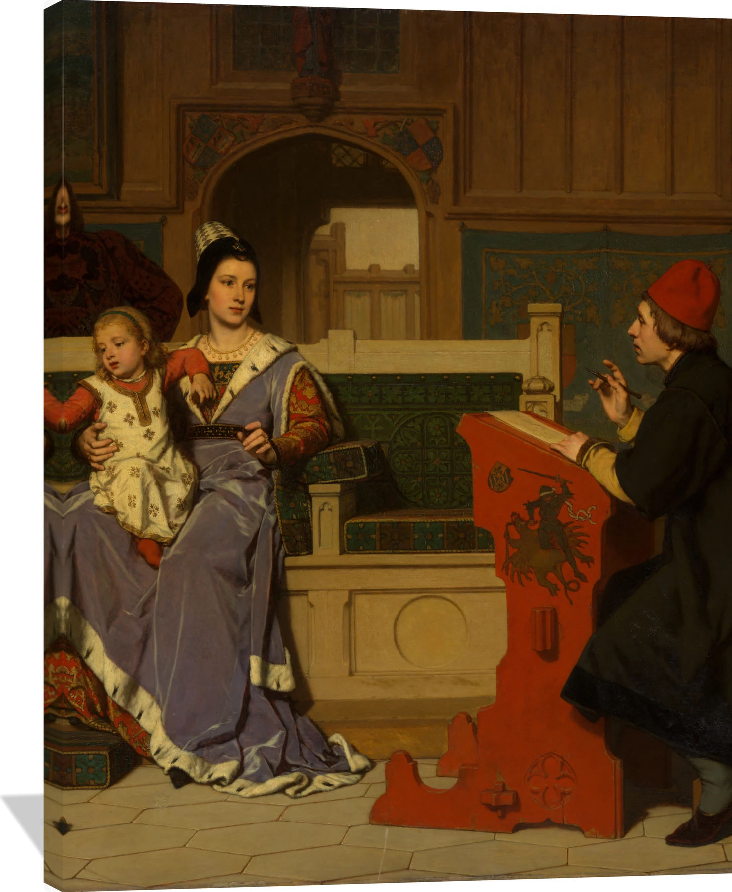 The Wilhelm Koller Hugo van der Goes Making a Portrait of Mary of Burgundy canvas captures a refined moment of artistic creation within a richly detailed medieval interior. Warm tones of gold, crimson, and emerald harmonize with soft lavender and deep brown, evoking a sense of quiet dignity and timeless elegance. The figures’ poised expressions and intricate surroundings reflect Koller’s mastery of historical realism.