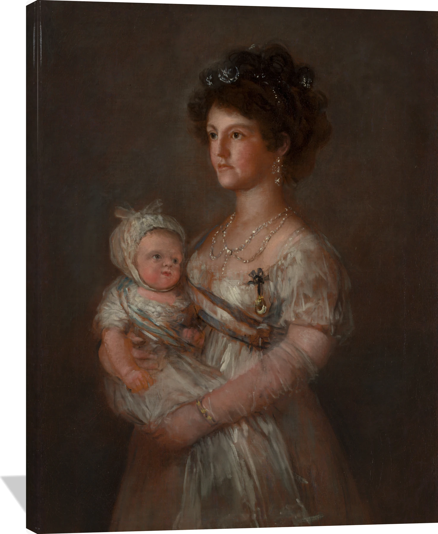 The Goya Infanta María Luisa (1782–1824) and Her Son Carlos Luis (1799–1883) canvas captures a tender moment of maternal grace with timeless sophistication. Soft earth tones, warm creams, and muted rose hues envelop the figures in gentle light, reflecting Goya’s mastery of intimacy and depth. The subtle contrast of delicate fabrics and rich shadows evokes both nobility and warmth.