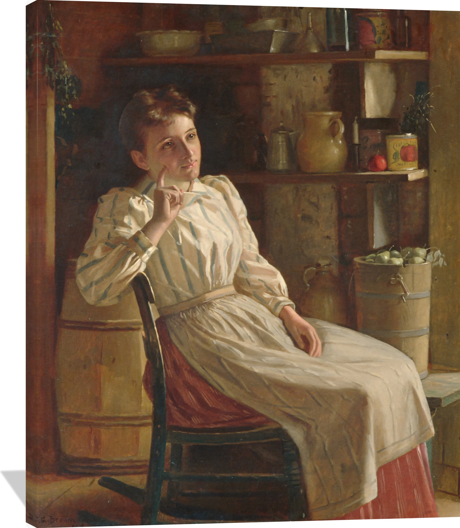 The John George Brown Meditation canvas captures a quiet moment of reflection bathed in warm, natural light. A young woman sits thoughtfully in a rustic interior, surrounded by earthen tones of ochre, cream, and soft brown, with subtle touches of red and green that enrich the composition. Brown’s masterful realism and tender atmosphere evoke calm introspection and timeless beauty.