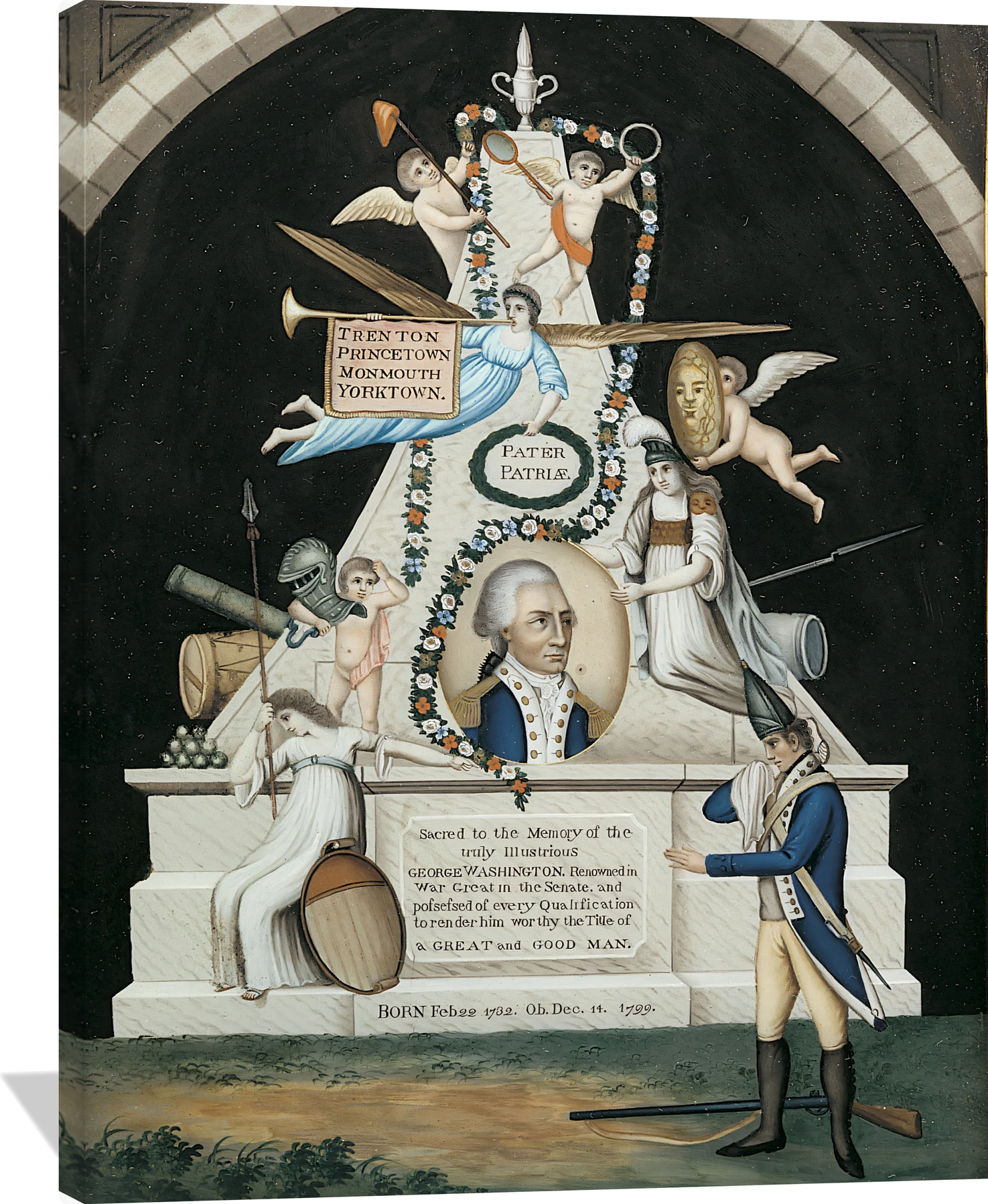The [unknown] Pater Patriae canvas captures a reverent neoclassical tribute rendered in soft ivory, muted blues, warm ochres, and deep charcoal tones. Centered around a stately figure framed by allegorical symbols and cherubs, this composition evokes dignity, remembrance, and national pride. The balanced symmetry and refined detail lend it a timeless, museum-quality presence.