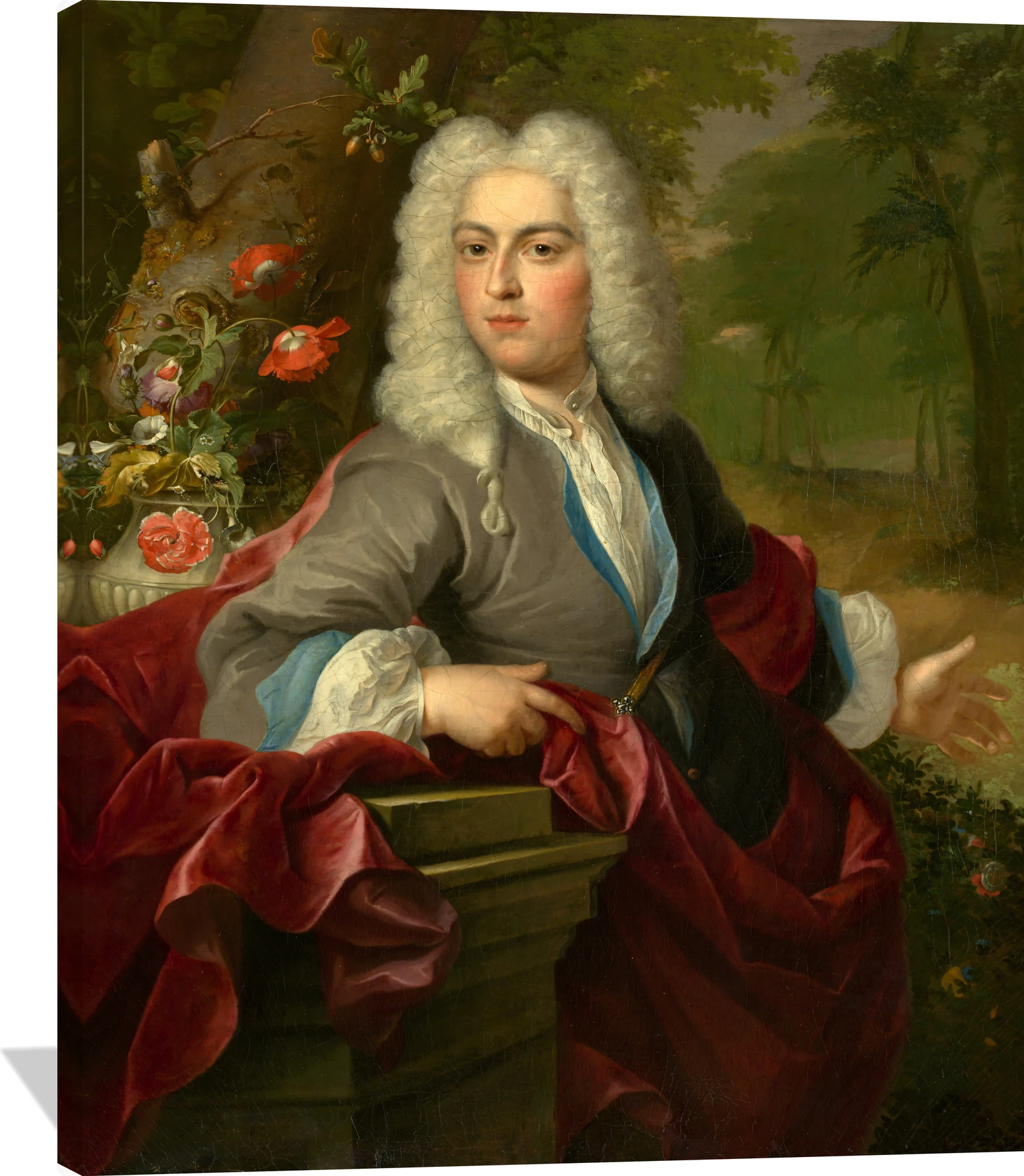 The Arnold Boonen Portrait of a Man canvas captures refined elegance and timeless poise. Set against a lush woodland backdrop, the sitter’s composed expression and flowing curls are framed by rich tones of crimson, slate gray, ivory, and soft green. Boonen’s masterful brushwork and delicate lighting evoke the grandeur of Dutch portraiture at its height.
