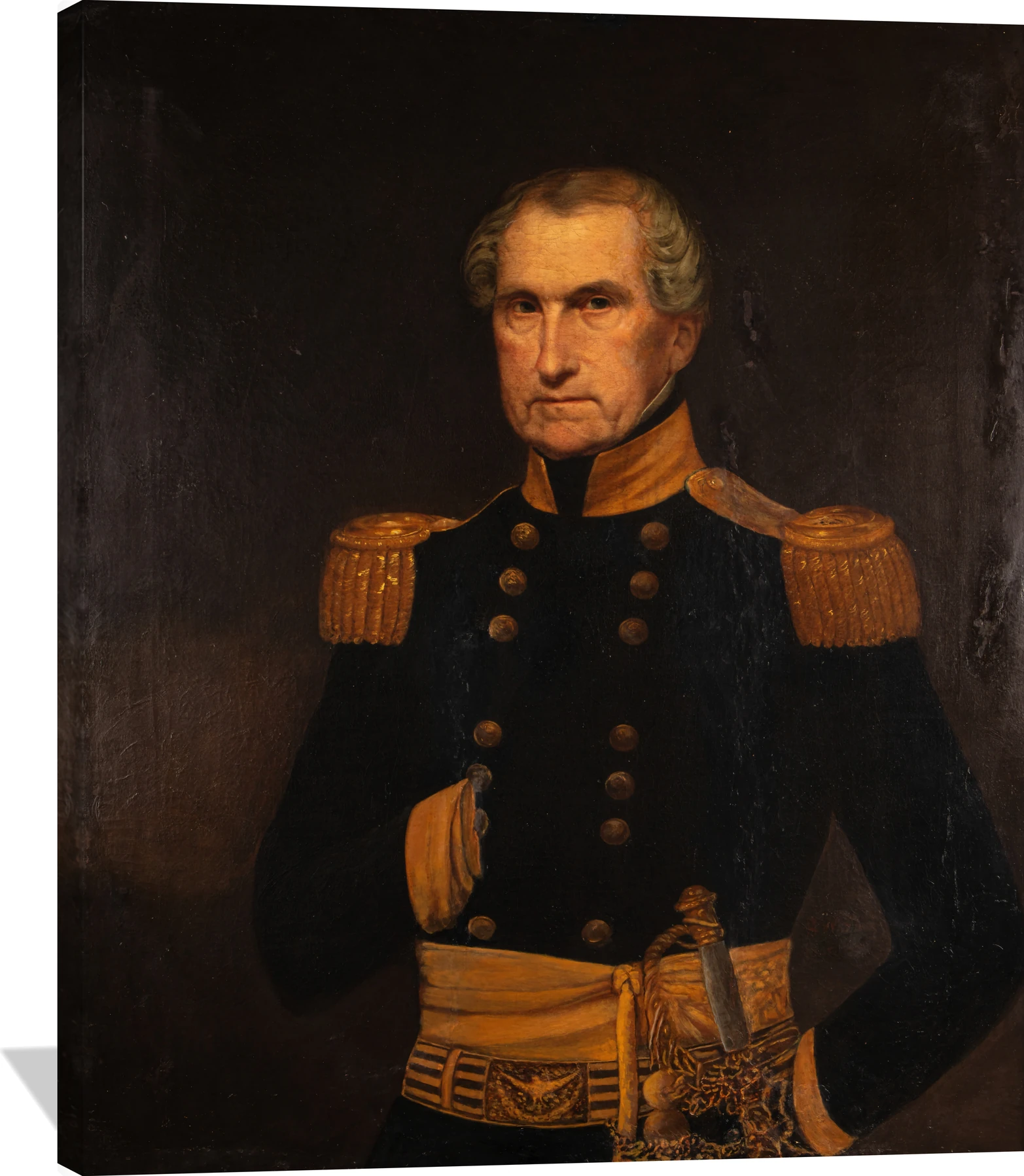 The Stephen William Shaw Portrait of Major-General John E. Wool canvas captures the commanding presence of a distinguished military leader with refined realism. Rich tones of deep black, gold, and warm brown create a dignified contrast, highlighting the intricate uniform details and the subject’s composed expression. The classic portrait style evokes strength, discipline, and heritage, making it a timeless statement piece.