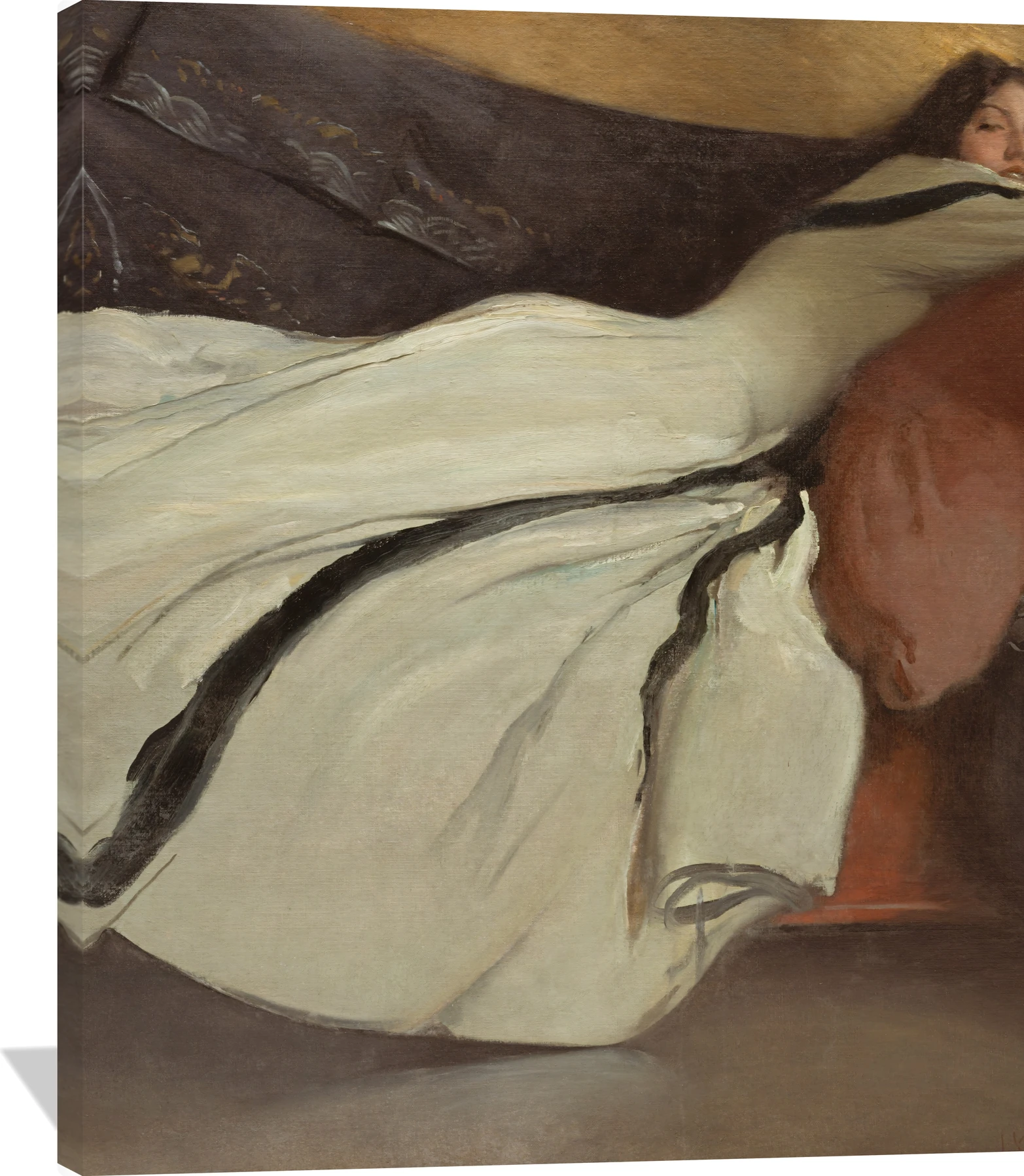 The John White Alexander Repose canvas captures a moment of serene elegance and quiet introspection. A woman reclines gracefully across a dark sofa, her flowing ivory gown illuminated against rich tones of bronze, charcoal, and soft cream. The composition’s sweeping lines and gentle contrasts evoke a sense of calm sophistication that draws the viewer inward.