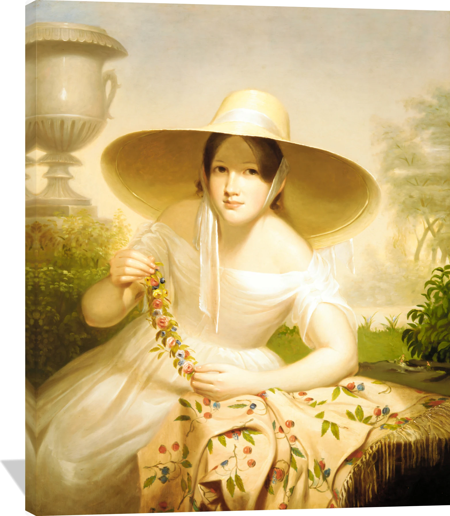 The Cephas Giovanni Thompson Spring canvas captures the radiant calm of a sunlit afternoon, where a young woman in soft white and gold tones pauses amid blooming nature. Gentle hues of cream, blush, sage, and sky blue evoke a timeless serenity, while the artist’s refined brushwork lends a luminous, classical grace to the scene.