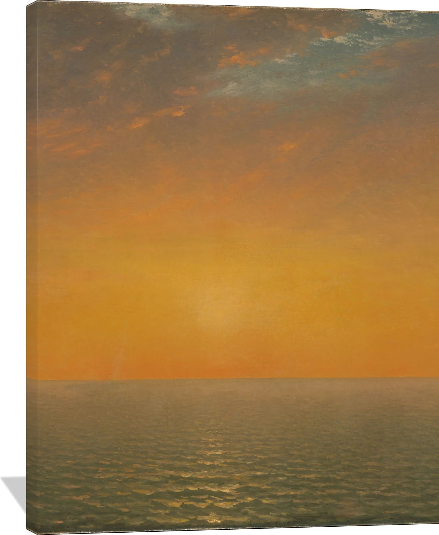 The John Frederick Kensett Sunset on the Sea canvas captures the serene meeting of sky and water in a radiant display of golden light. Soft gradients of amber, coral, and muted blue create a tranquil horizon that evokes calm reflection and timeless beauty. Kensett’s refined brushwork and mastery of atmosphere make this piece a luminous focal point for any space.
