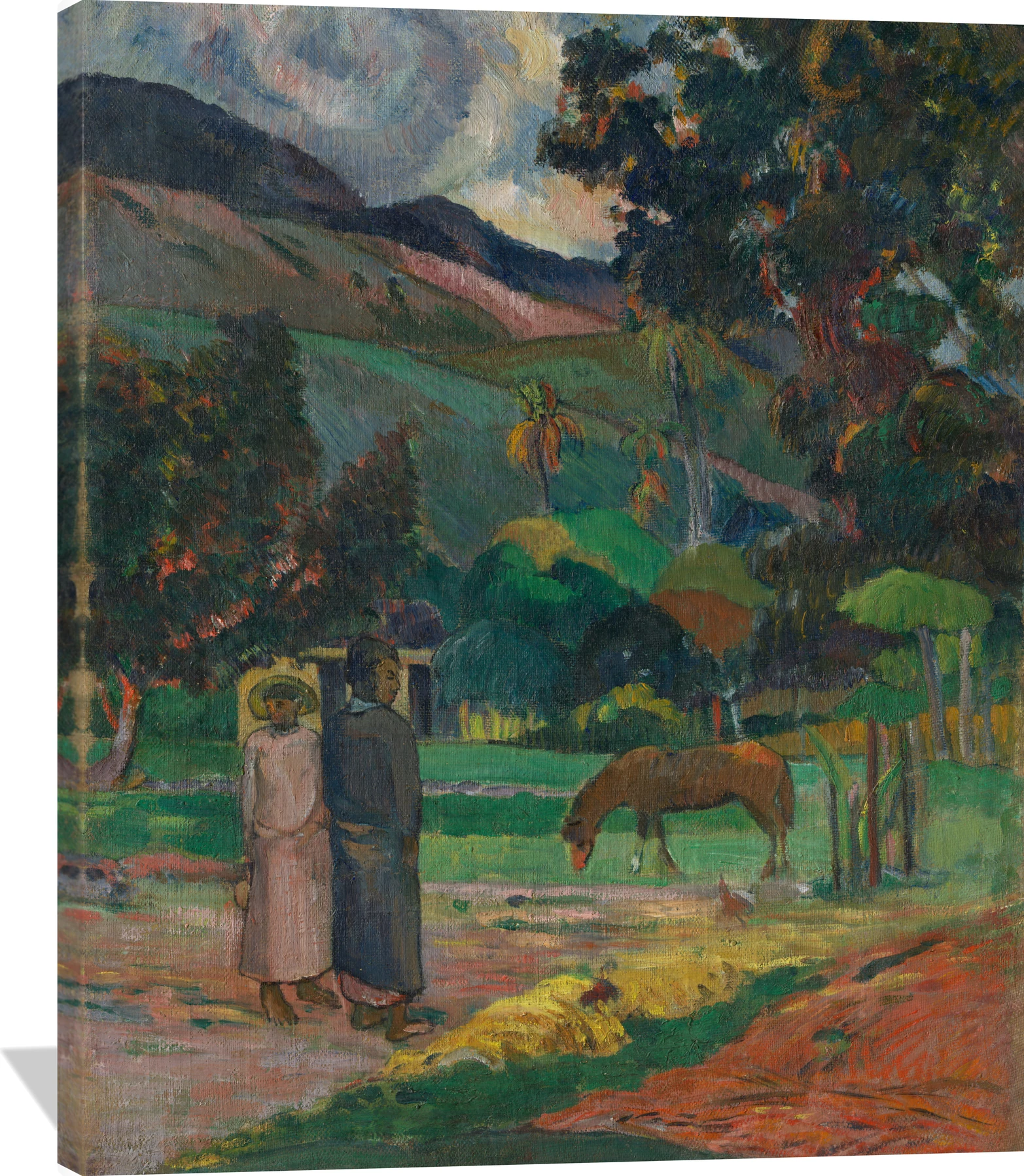 Paul Gauguin’s Tahitian Landscape canvas captures the tranquil beauty of island life through lush greens, earthy reds, and soft golden tones. Two serene figures and a grazing horse rest beneath dramatic tropical skies, evoking a sense of harmony between people and nature. The painter’s expressive brushwork and rich palette create a timeless scene that draws the viewer into Gauguin’s vision of paradise.