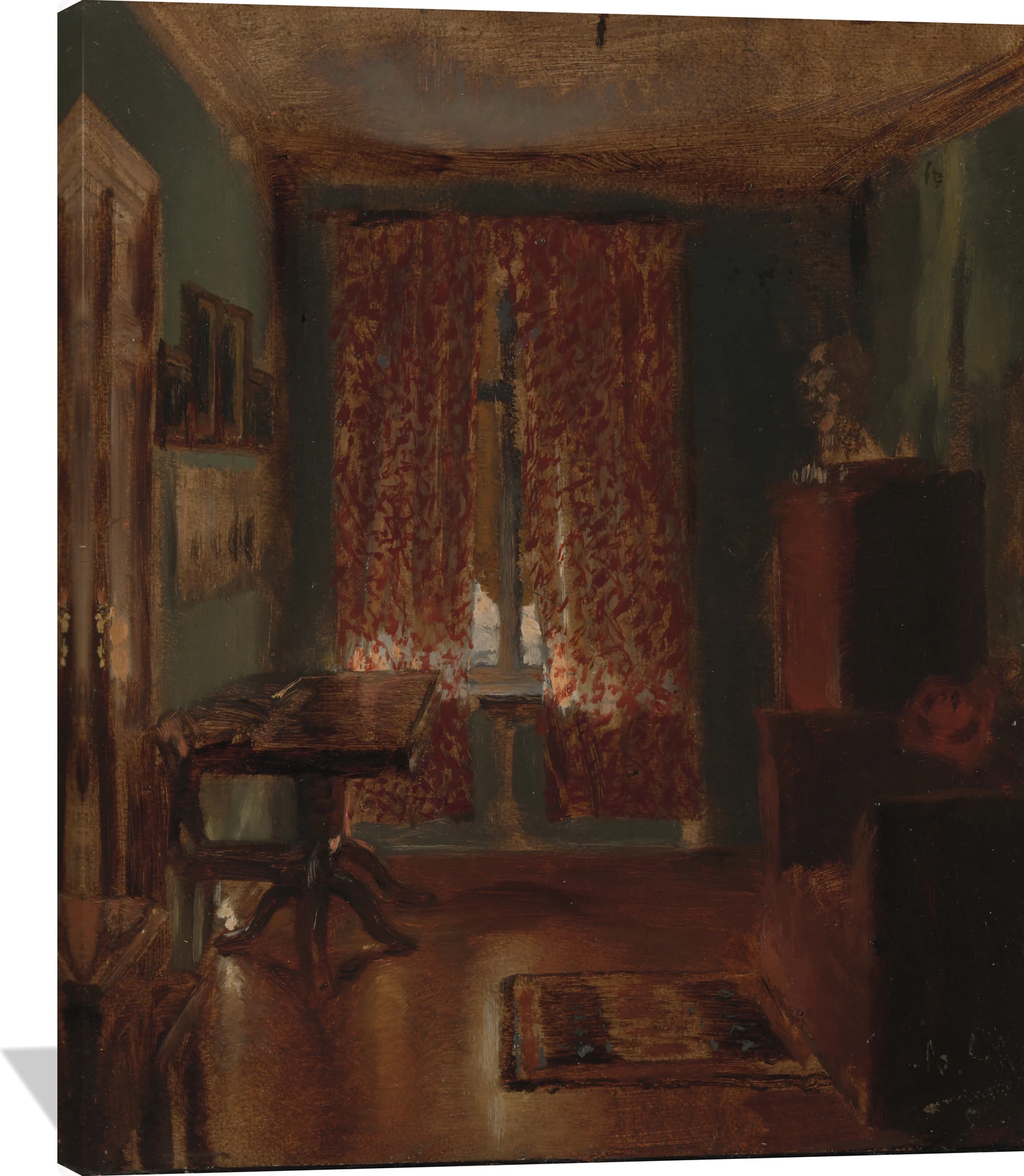 The Adolph Menzel The Artist’s Sitting Room in Ritterstrasse canvas captures a quiet, intimate interior bathed in warm, earthy tones of mahogany, olive green, and muted gold. The soft light filtering through patterned red drapes evokes a sense of solitude and reflection, characteristic of Menzel’s keen observation of everyday spaces. This finely detailed wall art brings depth and atmosphere to any room, inviting viewers into a moment of calm domestic beauty.