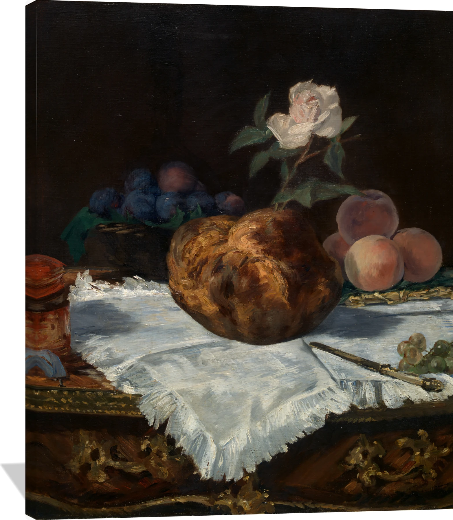 The Edouard Manet The Brioche canvas captures the quiet luxury of a still life steeped in golden light and rich texture. A perfectly baked brioche rests at the center, surrounded by ripe peaches, grapes, and a delicate rose, all rendered with Manet’s masterful balance of realism and painterly softness. Deep browns, warm golds, creamy whites, and soft blush tones create an atmosphere of refined calm and timeless beauty.