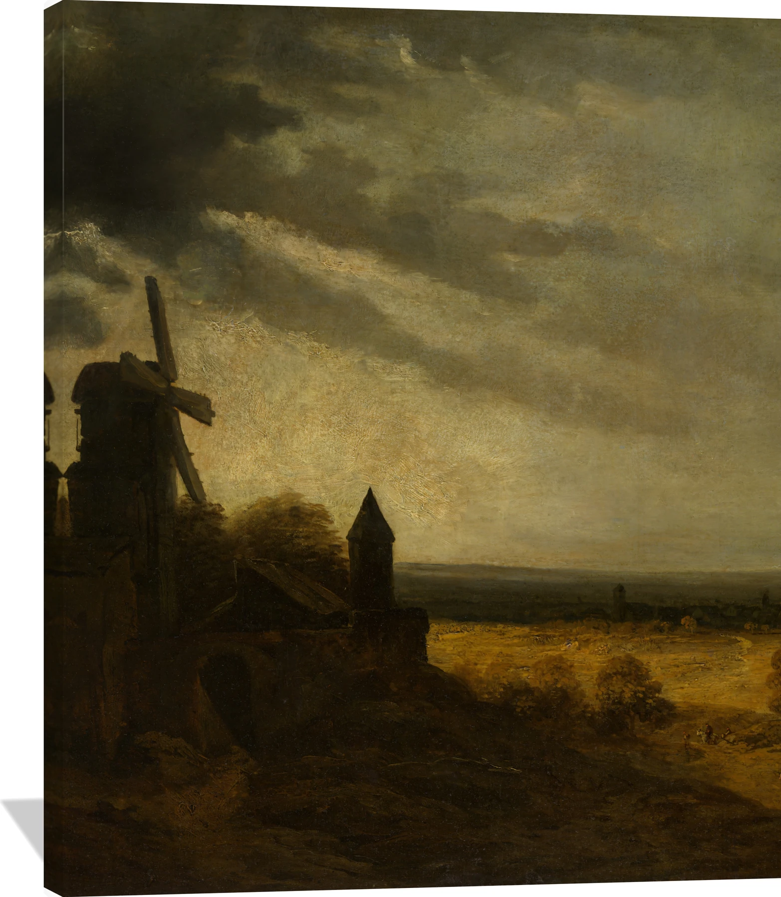 The Georges Michel The Mill of Montmartre canvas captures the quiet majesty of a Parisian landscape under a dramatic sky. Rendered in warm earth tones of ochre, deep brown, and muted gold, the scene balances rustic charm with atmospheric depth. The windmill stands silhouetted against soft light breaking through clouds, evoking both solitude and timeless beauty.