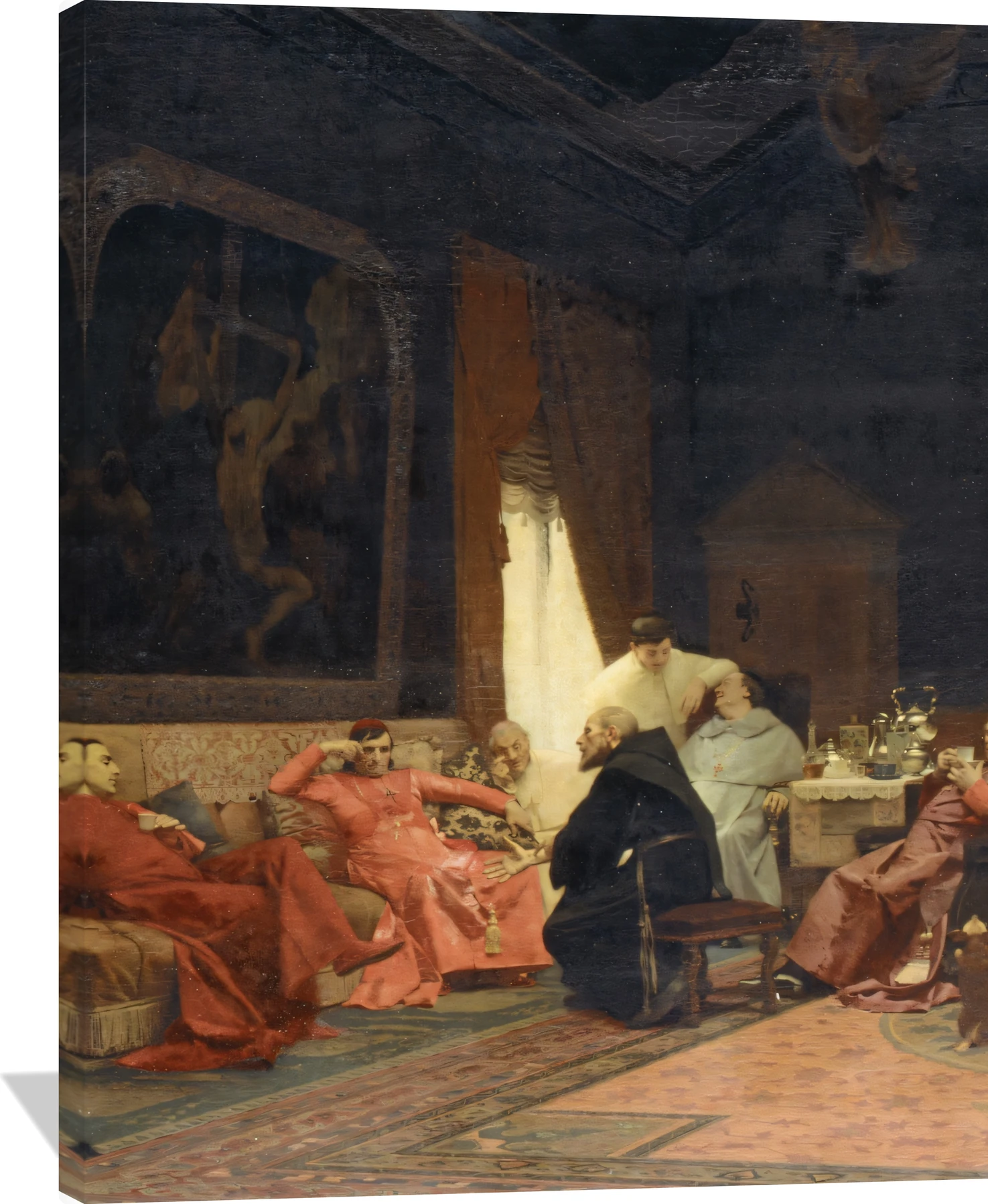 Best known for his satirical depictions of cardinals and clergy, Vibert used humor to illuminate human vanity, ambition, and folly. These works, while playful, carried a sharper edge that made them culturally resonant in his time and enduringly appealing today. He also produced elegant Orientalist scenes and domestic interiors, each rendered with careful attention to costume, décor, and atmosphere.