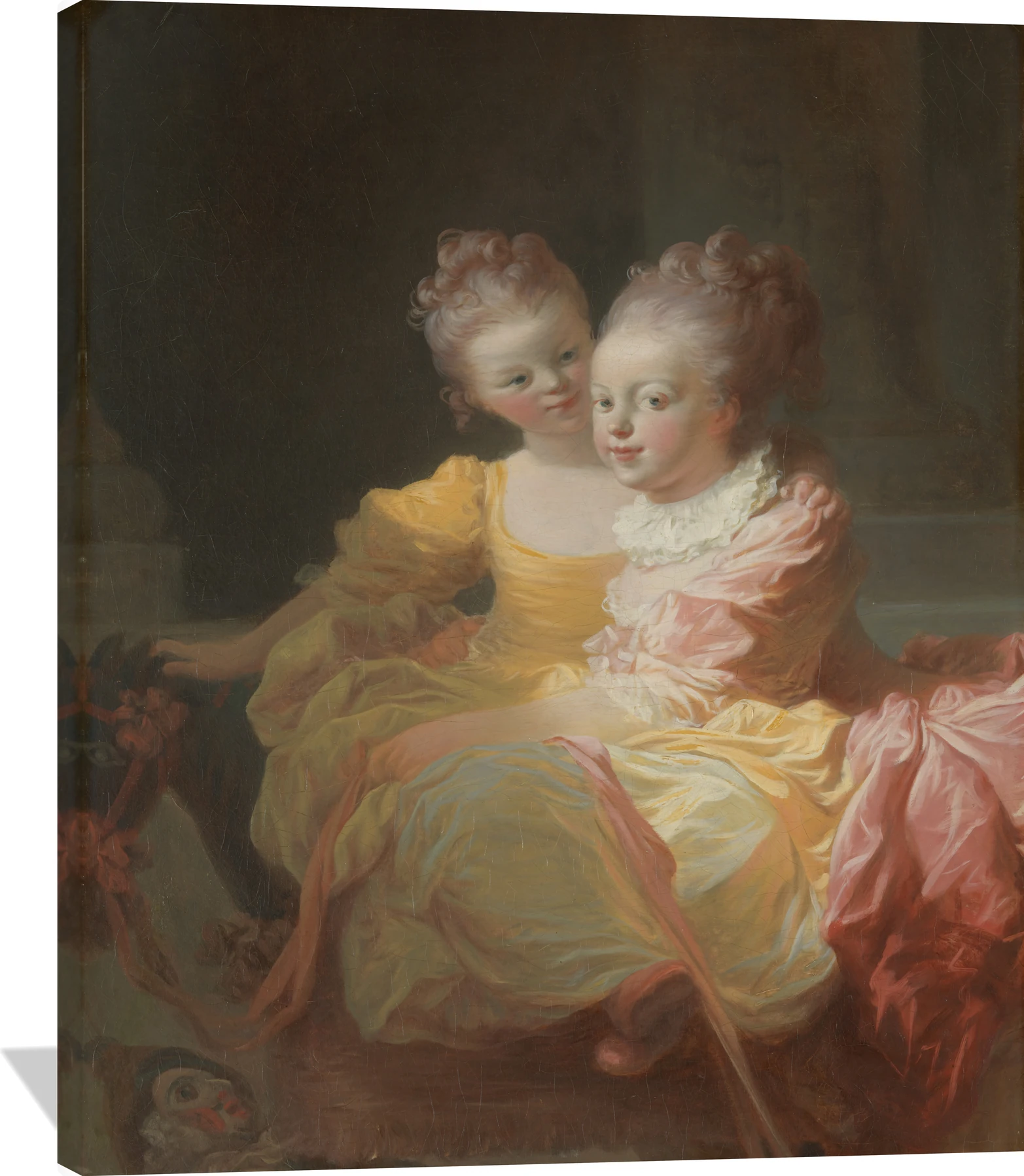 The Jean Honoré Fragonard The Two Sisters canvas captures the tender intimacy of childhood through soft pastels and luminous brushwork. Two young girls, dressed in delicate shades of rose, gold, and cream, share a quiet moment that radiates warmth and affection. Fragonard’s masterful Rococo style infuses the scene with lightness and grace, making it a timeless expression of innocence and charm.
