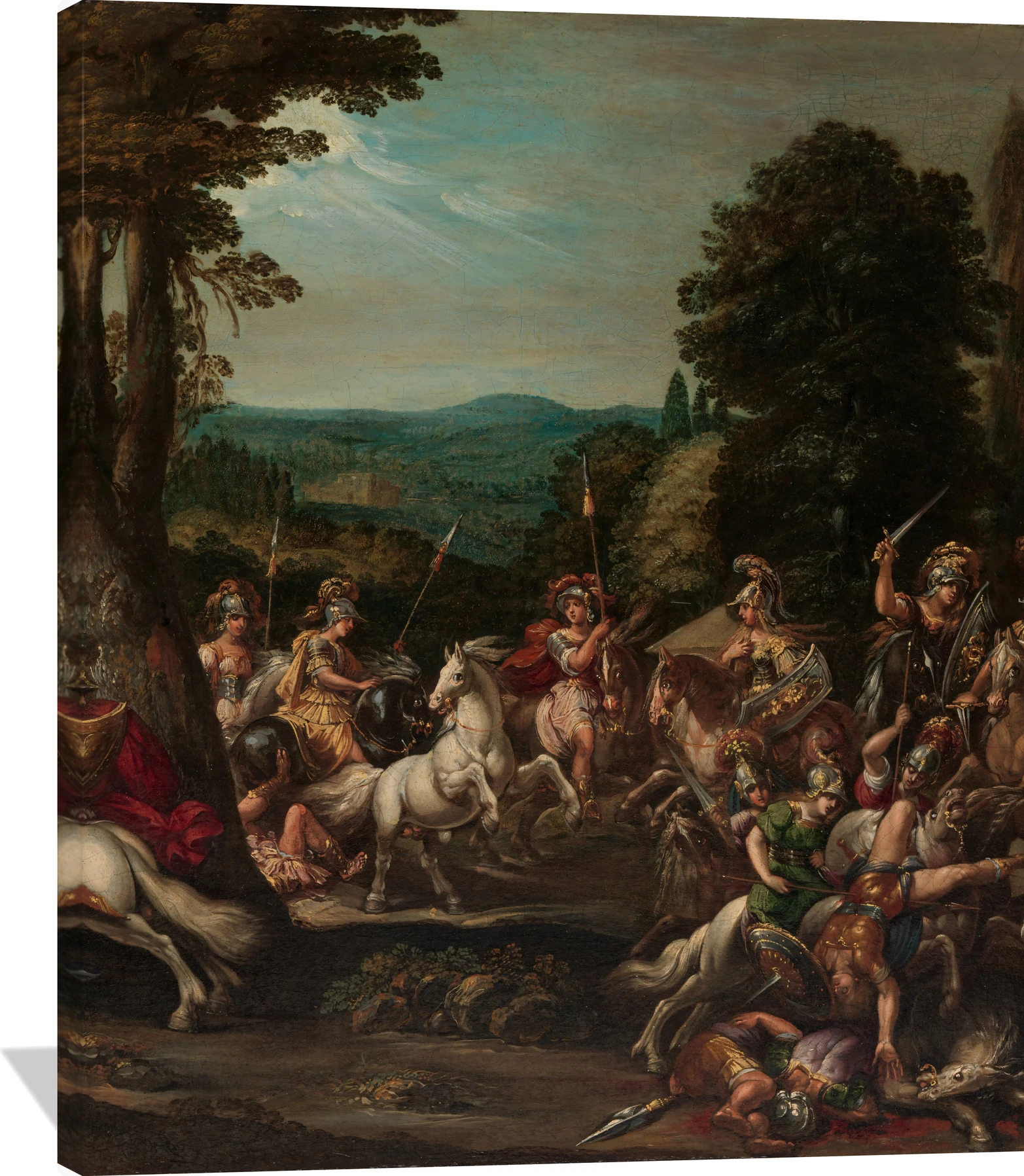 The Claude Déruet Triumph of the Amazons canvas captures a breathtaking moment of mythic valor, rendered in rich earth tones, deep greens, and warm golds. Déruet’s masterful brushwork brings to life a dynamic battle scene of warrior women on horseback, set against a sweeping landscape bathed in soft light. The composition’s movement and drama evoke both strength and grace, making it a captivating centerpiece for any space.