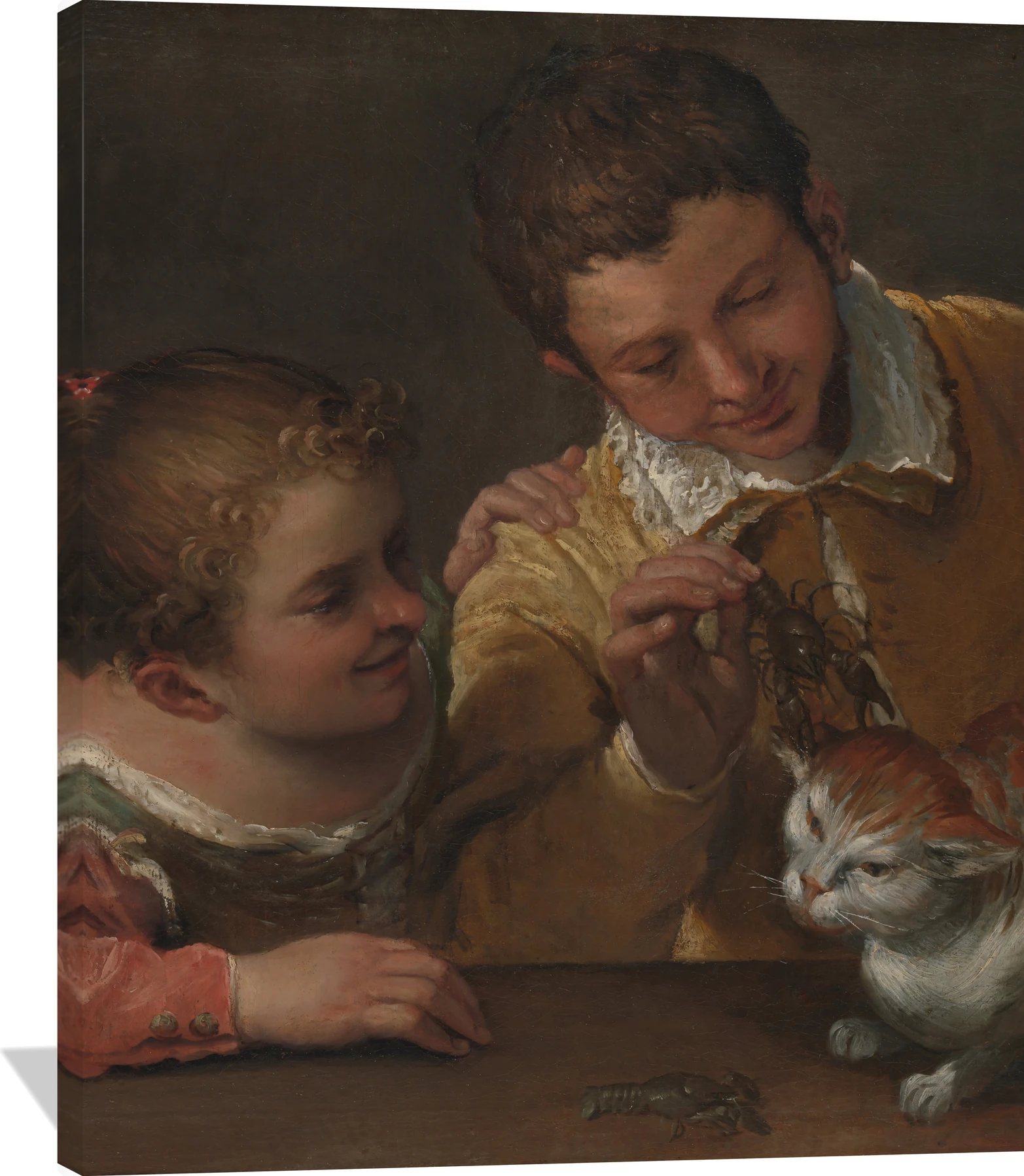 The Annibale Carracci Two Children Teasing a Cat canvas captures a lively moment of youthful mischief rendered with exquisite realism and warmth. Soft golden browns, muted reds, and gentle ivory tones bring depth to the tender expressions and playful energy of the scene, while Carracci’s masterful brushwork infuses the composition with both humor and humanity.