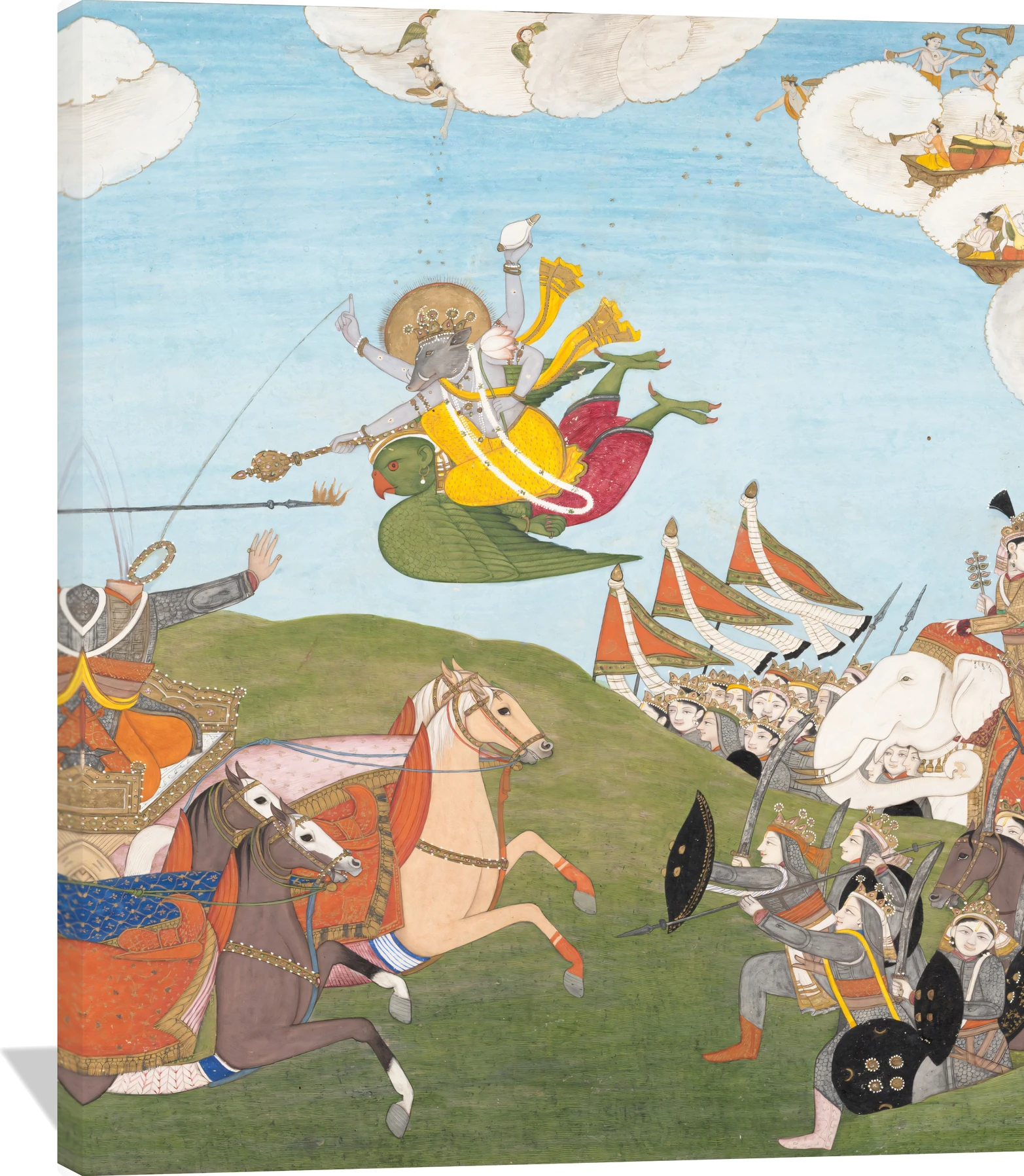 The [unknown] Vishnu as Varaha, the Boar Avatar, Slays Banasur, A Demon General canvas captures a moment of divine triumph rendered in exquisite traditional Indian miniature style. Vivid hues of gold, crimson, jade, and sky blue animate the celestial battle, as the deity’s dynamic form contrasts against serene clouds and disciplined armies below. Each brushstroke conveys both motion and majesty, making it a striking focal point for any refined space.