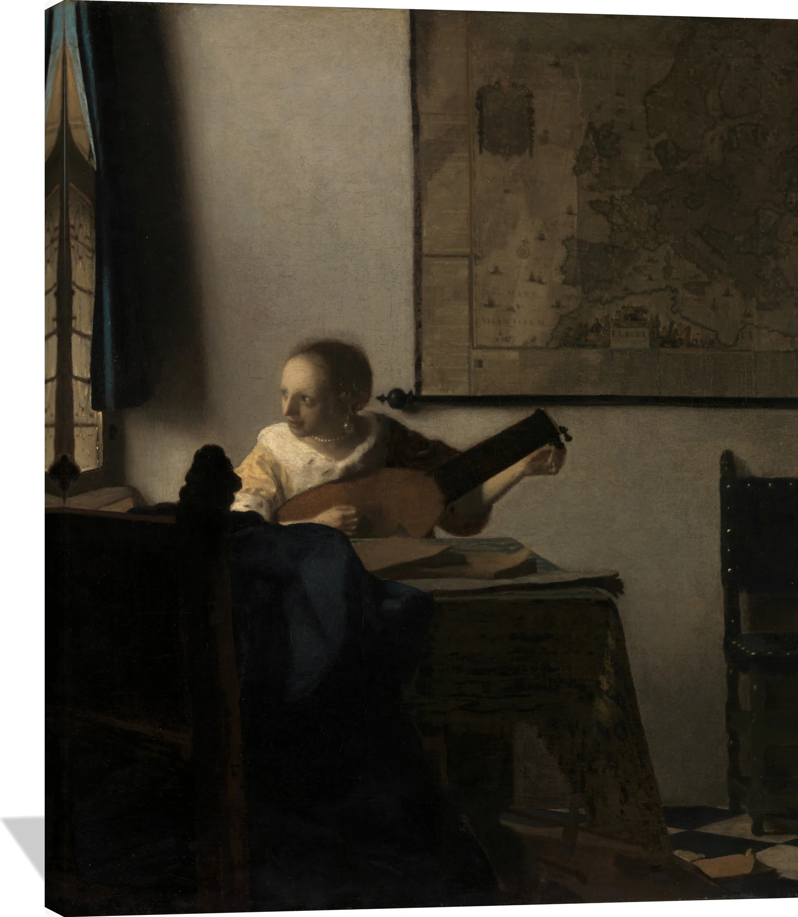 The Johannes Vermeer Young Woman with a Lute canvas captures a quiet moment of harmony and light. Bathed in soft daylight, a young woman turns toward a window, her lute resting gently in her hands. Subtle hues of ochre, deep blue, and warm cream create a serene atmosphere that reflects Vermeer’s mastery of light and intimacy.